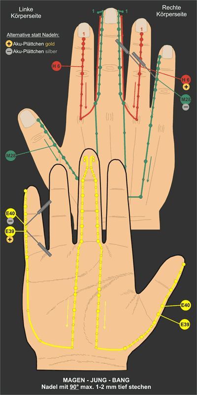 im 90° (gerade) Winkel setzen. Alternativbehandlung: „MILZ - JUNG - BANG“ (Sympathikusorgan